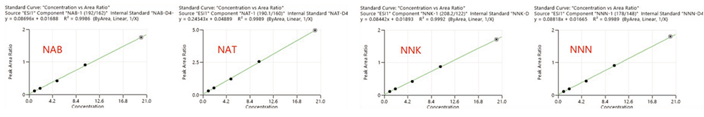 采用 0.1mol/L 乙酸銨溶液稀釋成 1ng/mL-20ng/mL 的系列校準(zhǔn)標(biāo)準(zhǔn)溶液,并繪制標(biāo)準(zhǔn)曲線,用內(nèi)標(biāo)法進(jìn)行定量分析。圖 3 為 4 個化合物的標(biāo)準(zhǔn)曲線情況,各化合物線性關(guān)系均較好,R 均大于 0.998。