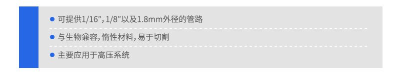 PEEK(聚醚醚酮)聚合物管對絕大多數(shù)化學(xué)溶劑惰性、具有生物容性等特點(diǎn),可替代不銹鋼管用于常規(guī)液體分析系統(tǒng)中。與不銹鋼管和鈦金屬管不同,PEEK管具有韌性、截取方便,PEEK管能使用不銹鋼或聚合物接頭。