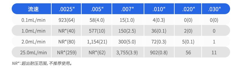 PEEK聚合物管的優(yōu)點(diǎn)還包括耐高壓(一般可達(dá)7000psi)和耐高溫(高連續(xù)使用溫度100°C)。此外,PEEK管內(nèi)表面非常光滑,所引起的紊流比相同尺寸的金屬管小。案流會(huì)導(dǎo)致已分離的樣品重新混合及由流