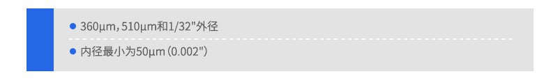 PEEKSIL管的外徑公差:對于1/16"的管子為±0.3mm;內(nèi)徑公差:50μm內(nèi)徑是±3μm,100μm或175μm內(nèi)徑管為±5μm。