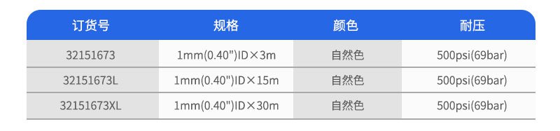 該種管有1/16"和1/8"外徑兩種規(guī)格,外徑和內(nèi)徑的公差分別為±0.001"和±0.003"。這種聚合物材料在100℃操作溫度下不會(huì)降低其機(jī)械強(qiáng)度。