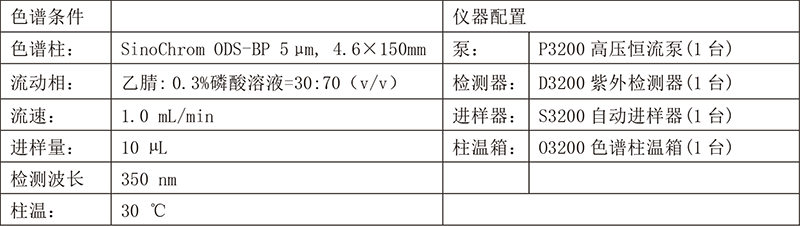 依利特新款的EClassical 3200液相色譜儀搭配經(jīng)典的SinoChrom ODS-BP色譜柱,對中藥北劉寄奴樣品進(jìn)行分析,峰形良好,分離度高,滿足定性定量分析的需求。