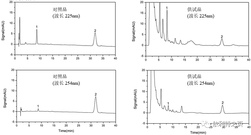 2. 供試品溶液的制備:取重量差異項下的本品,研細,取約0.5g,精密稱定,置具塞錐形瓶中,精密加入甲醇50mL,稱定重量,超聲處理(功率250W,頻率70kHz)40分鐘,再稱定重量,用甲醇補足減失的重量,搖勻,濾過。精密量取續(xù)濾液10mL(剩余溶液備用),加置中性氧化鋁柱(200~300目,4g,柱內(nèi)徑為1.5cm)上,用甲醇30mL洗脫,收集洗脫液,濃縮至約2mL,用適量甲醇轉(zhuǎn)移至5mL量瓶中,加甲醇稀釋至刻度,搖勻,濾過,取續(xù)濾液,即得。